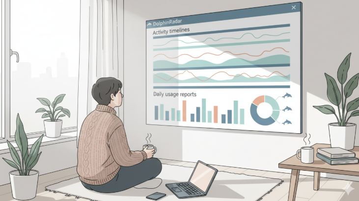 DolphinRadar’s dashboard displaying activity timelines and daily usage reports.