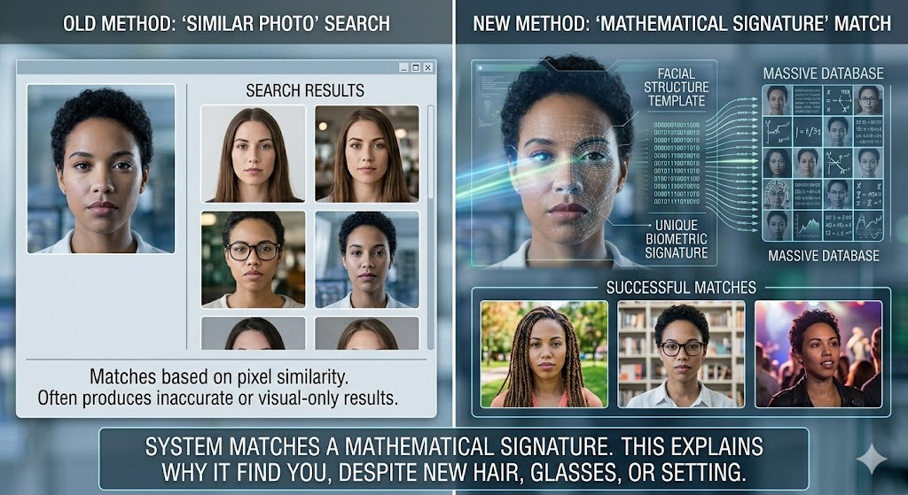 Instead of searching for “similar photos,” the system searches its massive database for a matching mathematical signature. This is why you can find social media accounts by photo even if the person has changed their hair, is wearing glasses, or is in a completely different setting than the original image.